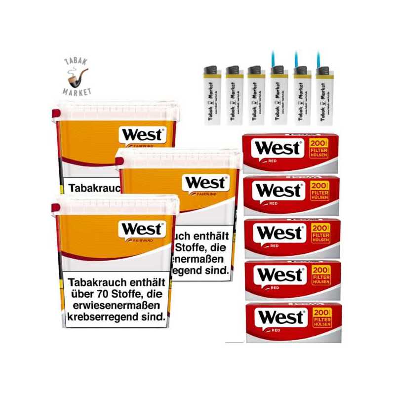 Dieses umfassende Sparpaket bietet Ihnen drei Eimer West Yellow Tabak à 235g, 1000 West Red Filterhülsen und sechs Feuerzeuge. Es stellt eine praktische Lösung dar, um sich ausreichend mit Tabak und Zubehör einzudecken.